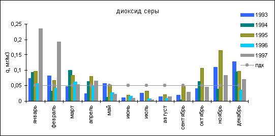 Концентрации диоксида серы. Средняя за год превышала санитарную норму в 1.2 раза. Согласно годового хода среднемесячных концентраций в период с 1993- 1997 г.г. увеличение содержания диоксида серы отмечается в холодные месяцы: январь - апрель и октябрь - декабрь.
