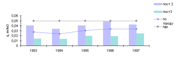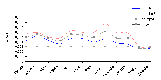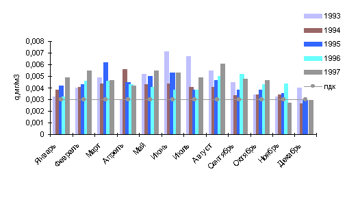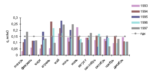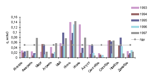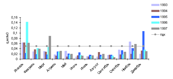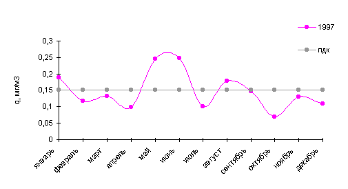 В 1997г. среднемесячные концентрации в городе были выше нормы в 1.6 раза в мае и июле, в 2.8 раза - в июне, а в зимние месяцы - в феврале (1.5 ПДК) и октябре (1.3 ПДК).